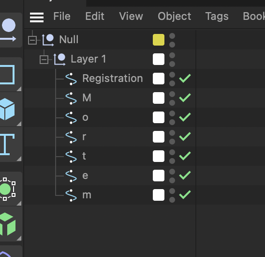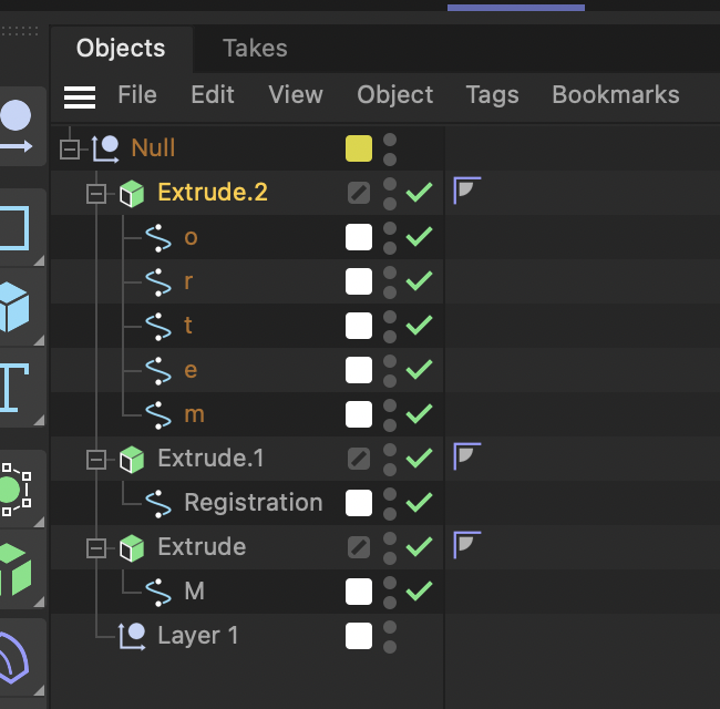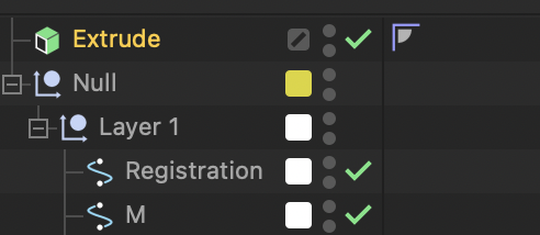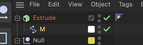 - Go up and select the Extrude Tool, click and hold to open up its menu, and choose Extrude. An Extrude object is added to the Object Manager. Now drag the M object to the extrude layer